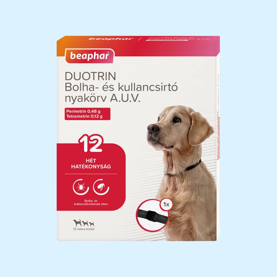 MINDIG OLVASSA EL A TERMÉK CSOMAGOLÁSÁN LÁTHATÓ LEÍRÁST HASZNÁLAT ELŐTT! A Beaphar bolha-, és kullancsirtó fekete nyakörv kutyák részére A.U.V. nagy és átlagos testméretű kutyáknak készült. Közvetlenül a felhasználás előtt bontsuk ki a becsomagolt nyakörvet. Lazán helyezzük a nyakörvet a kutya nyaka köré úgy, hogy két ujjunk a nyak és a nyakörv közé beférjen. A nyakörv végét fűzzük át a bújtatón és a feleslegesen maradt részt vágjuk le. A készítmény folyamatos viselés esetén 12 hétig hatékony bolhák és kullancsok ellen. A nyakörv víz hatására sem veszíti el a hatékonyságát.